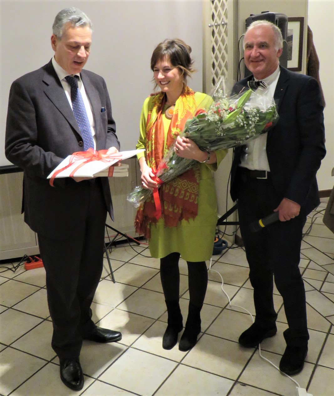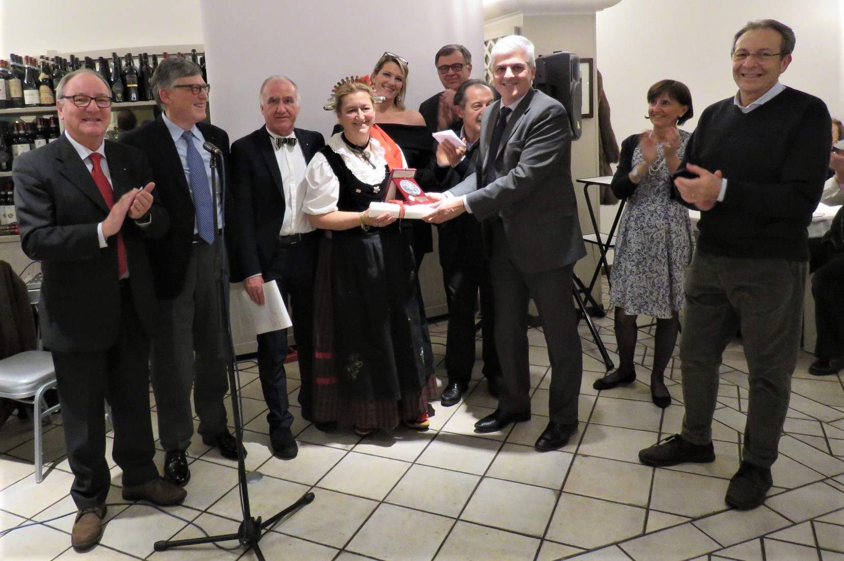 Dopo antipasto e primo piatto, ecco la prima premiazione, una novità introdotta dal nuovo consiglio della Bosina. E’ stata premiata, come donna dell’anno, Sandra Coecke, ricercatrice belga a Varese da 22 anni, su progetto dell’Unione Europea. Un bel modo per festeggiare una donna, oltretutto -come ha sottolineato il regiù Luca Broggini- non nativa di Varese, e del resto non dimentichiamo che la giöbia nasce proprio per salutare gli uomini, che riprendevano i lavori all’estero dopo la pausa natalizia.